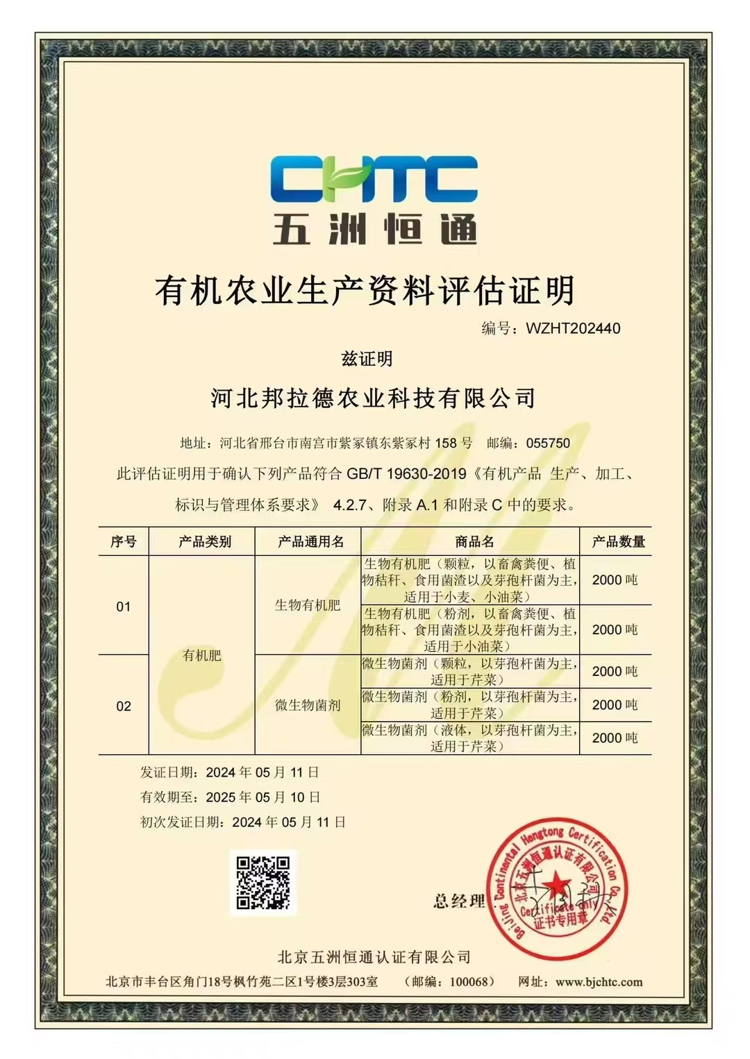 河北邦拉德农业科技有限公司成立于2023年,主要从事生物有机肥料研发;复合微生物肥料研发;以及肥料销售等业务,是“河北省科技型中小企业”,河北省肥料协会常务理事单位;其推出的新欧仕益邦品牌先后在中央电视台15频道和17农业频道亮相播出。 新欧仕益邦系列产品已通过“农业生产资料有机认证”,并具有多种作物“零药残”的检测报告。